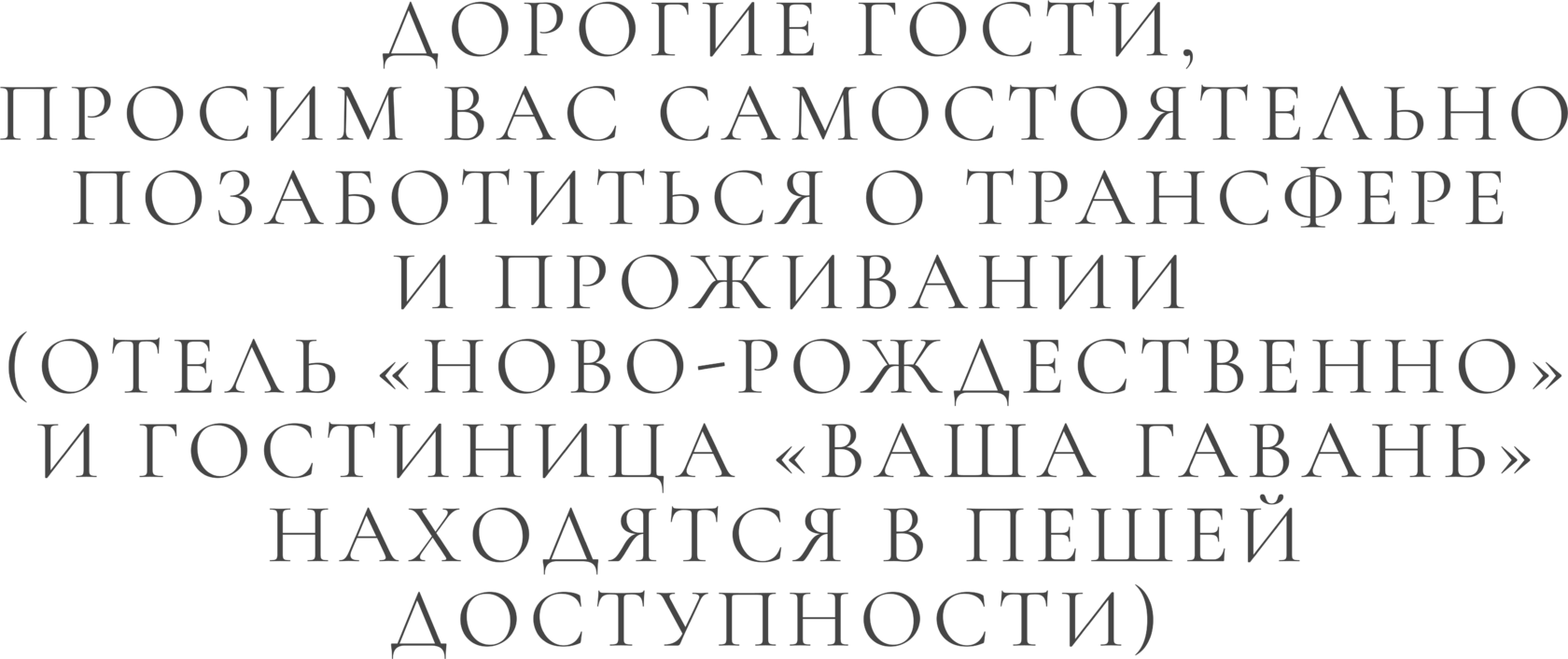 Дорогие гости, просим вас самостоятельно позаботиться о трансфере и проживании (отель «Ново-Рождественно» и гостиница «Ваша Гавань» находятся в пешей доступности)